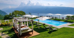 Lefay Resort & Spa - modernes Resort hoch über dem Gardasee: Gästen bieten sich in ruhiger Lage ein spektakulärer Panoramablick sowie eines der besten Spas Europas. In weitläufigen Räumen wird der Stil des Interieurs von natürlichen Materialien wie Marmor und Nussbaumholz bestimmt.